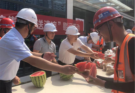 在慰問現(xiàn)場,張杰為參建人員送上香梨、西瓜、藿香正氣水等防暑慰問物資,并與在場人員親切交談,并代表市城控集團黨委感謝大家不畏酷暑,堅守在一線崗位,默默付出,叮囑大家在工作時務(wù)必注意身體健康和勞動安全。同時,他囑咐鑫建公司負責人進一步加強夏季人員的勞動保護和防暑降溫工作,按照“抓兩頭、歇中間”的原則調(diào)整好作業(yè)時間,控制室外作業(yè)時間和勞動強度,普及好防暑降溫和中暑急救知識,確保勞動者的生產(chǎn)生活安全及身體健康。