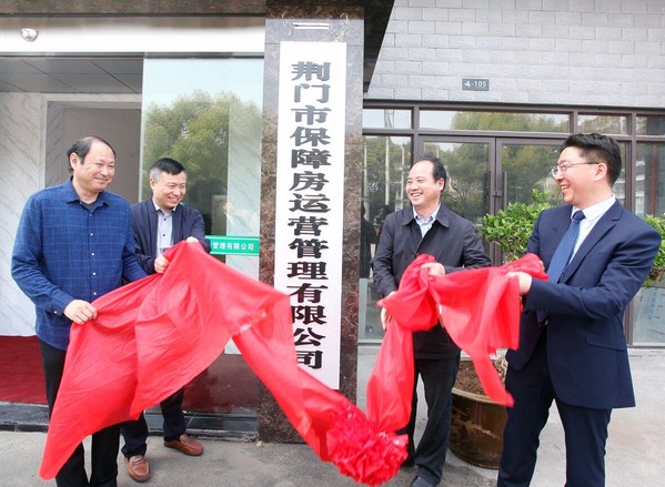 圖為杜佐鵬、豐金亮、李俊峰、楊清華共同為荊門市保障房運(yùn)營(yíng)管理有限公司揭牌